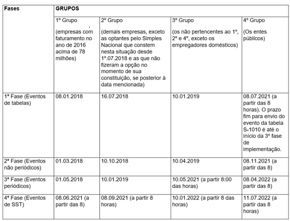 O Secretário Especial de Previdência e Trabalho e o Secretário Especial da Receita Federal, por meio da Portaria Conjunta SEPRT/RFB nº 76/2020 , a qual entrará em vigor em 1º.11.2020, aprovaram o novo cronograma simplificado de implantação do eSocial, conforme a seguir: